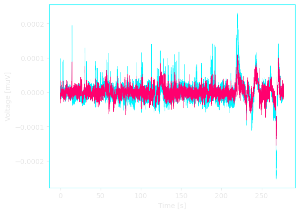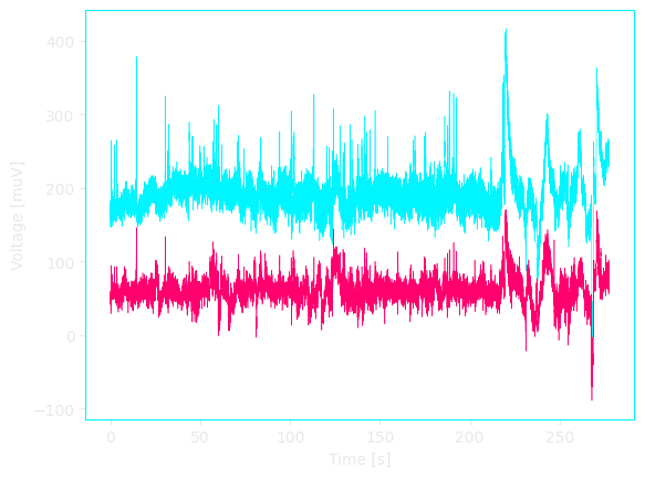 Channels differ in their conductivity with the scalp and this conductivity may also change across time, for example if the subject is sweating. This results in different and drifting baselines that can overshadow neural activity. Let’s look at two exemplar channels:
