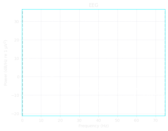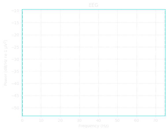 Another ubiquitous problem is the presence of power line noise. This takes the form of an oscillation at the frequency of the alternating current signal which is 60 Hz in the US and 50 Hz in the rest of the world. To see this, we can plot the power spectral density (PSD), which shows the signals power content across frequencies.